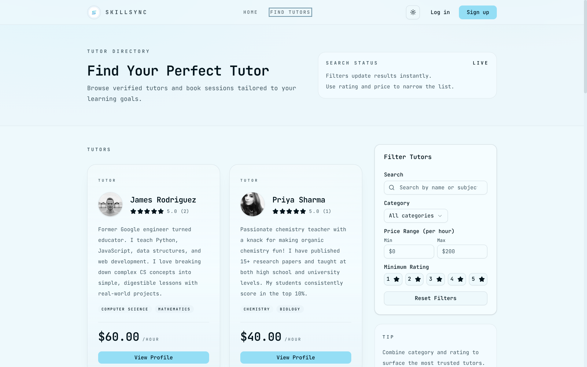 Category-based filtering, subject search, and tutor profile cards with ratings and session counts. Students can find the right tutor in seconds.