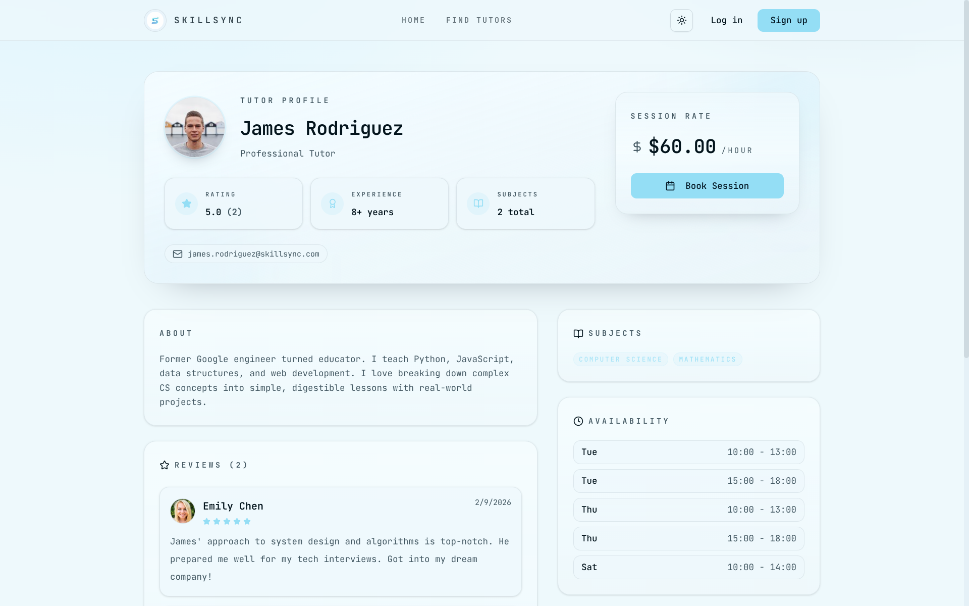 A full-featured tutor marketplace - four distinct user roles, each with their own purpose-built experience. Students discover and book tutors. Tutors manage their availability and sessions. Administrators oversee the platform. All secured with role-based access control at every layer.